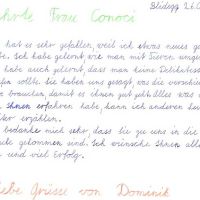 Mir hat das ruhige Auftreten von Sonya inklusive Aysha (Sonyas Hündin) sehr gut gefallen. Die Klasse konnte sich so gut auf die Lektionen einlassen. Mit einigen sehr spannenden Fragestellungen konnte die Klasse zu sehr spannenden Erkenntnissen und Überlegungen angeleitet werden.